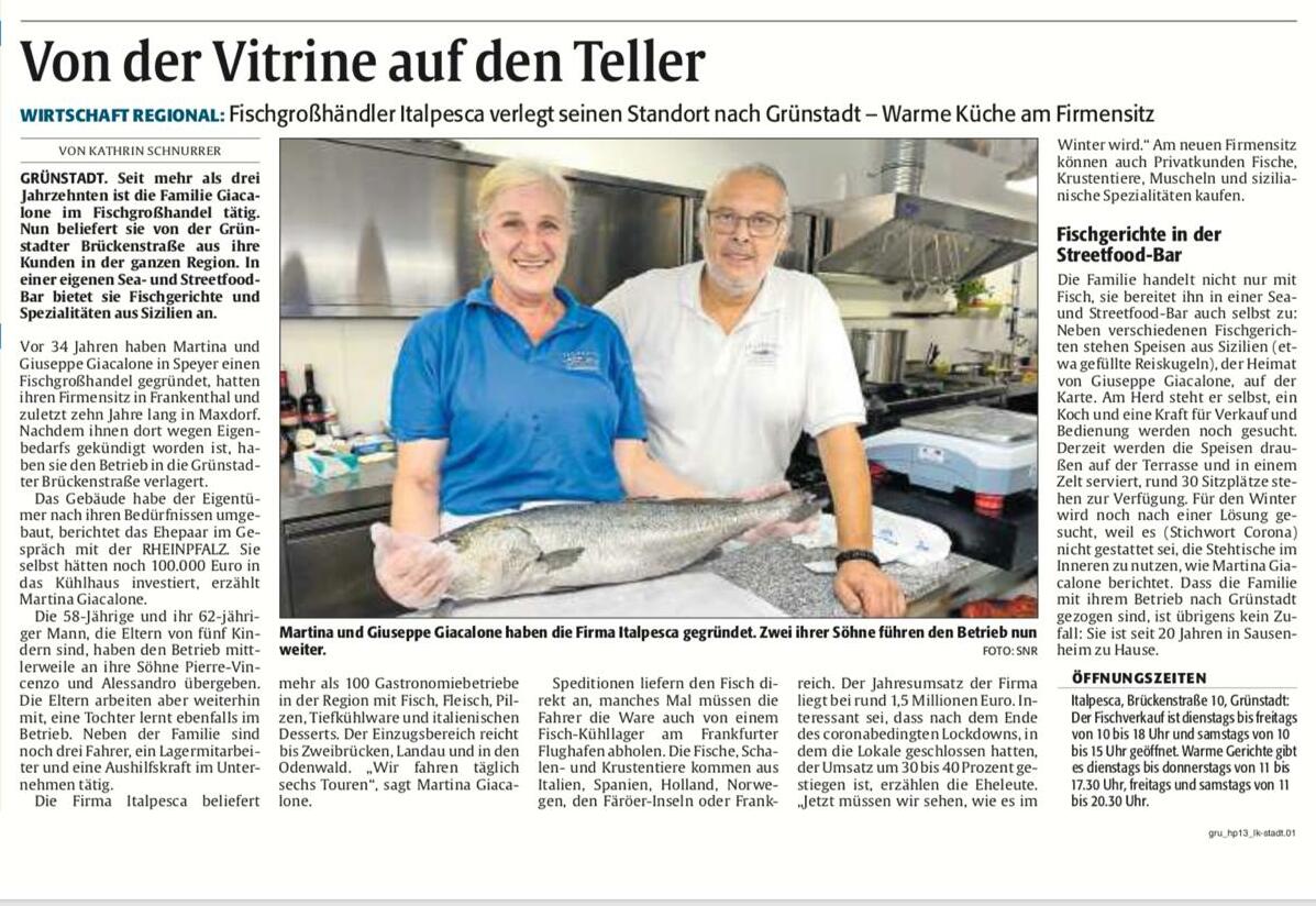 Wir sind ein 1988 in Speyer gegründetes Familienunternehmen mit Sitz in Grünstadt. Die Produktpalette unseres Groß u. Einzelhandels umfasst Frischfisch, Fischfilets, Schalen- und Krustentiere, Tiefkühlprodukte, Feinkost, Frischpilze und Fleischspezialitäten. Dabei beziehen wir dreimal wöchentlich frische Qualitätsprodukte aus: Italien, Holland, Frankreich, Dänemark, Spanien, Griechenland und weiteren Ländern. Durch die jahrzehntelange Erfahrung schätzen uns unsere Kunden als fachkundigen, zuverlässigen und flexiblen Partner. Bestellannahme Gastronomie: Email 24 h, Telefonisch: 8 - 18 Uhr. Wir sind kunden- und serviceorientiert und liefern täglich, im Umkreis von 100 Kilometern. Unsere Betriebsräume und Kühlfahrzeuge sind auf dem neuesten technischen Stand - dies garantiert Frische und Qualität.